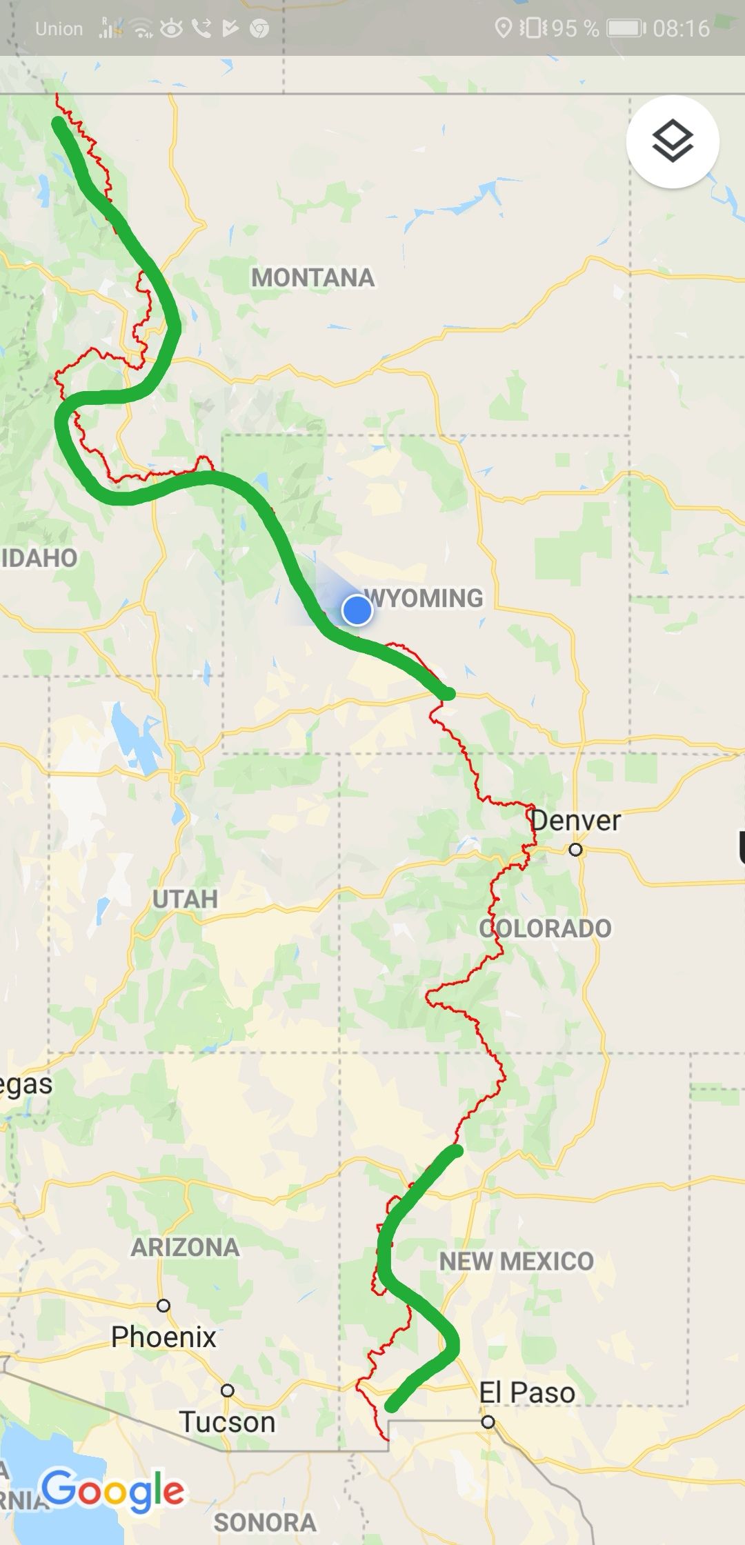 Hier hab ich in Grün die Strecke markiert die ich gewandert bin. In rot ist der original CDT. Insgesamt ist die Strecke ca 2028 Meilen, ein bisschen mehr wenn die doppelt gelaufen Strecke mitgezählt wird.