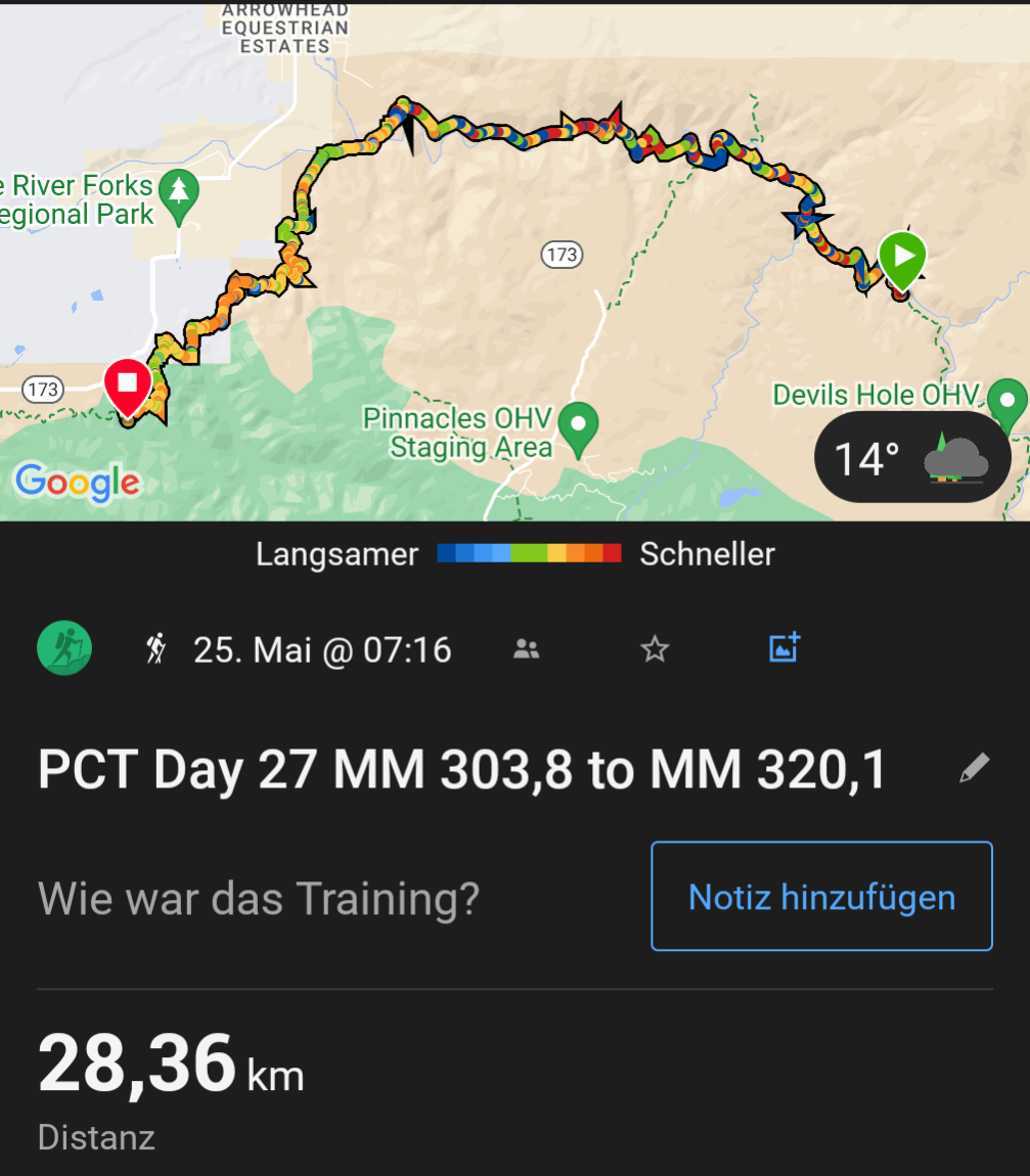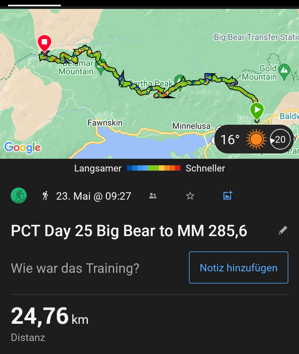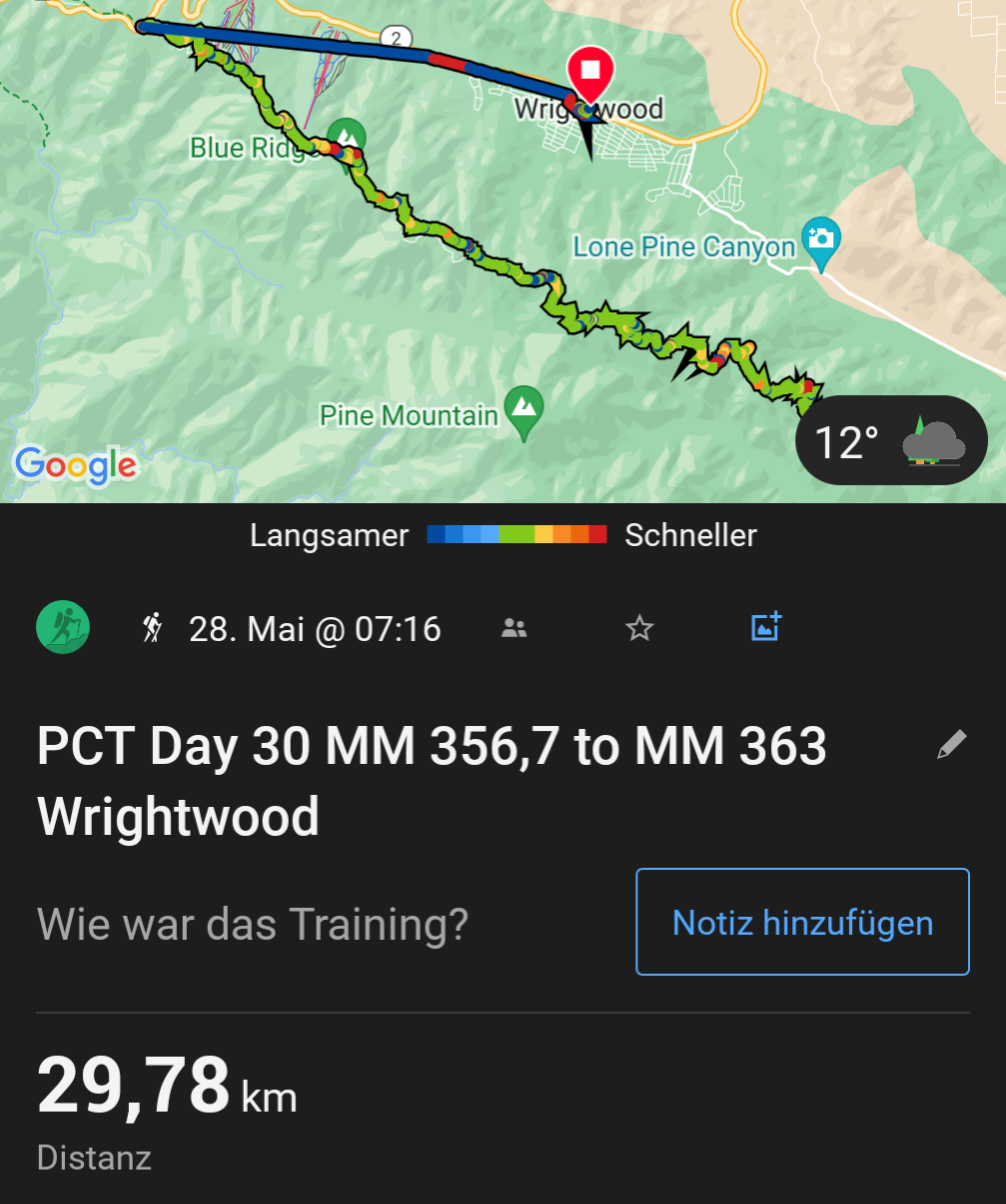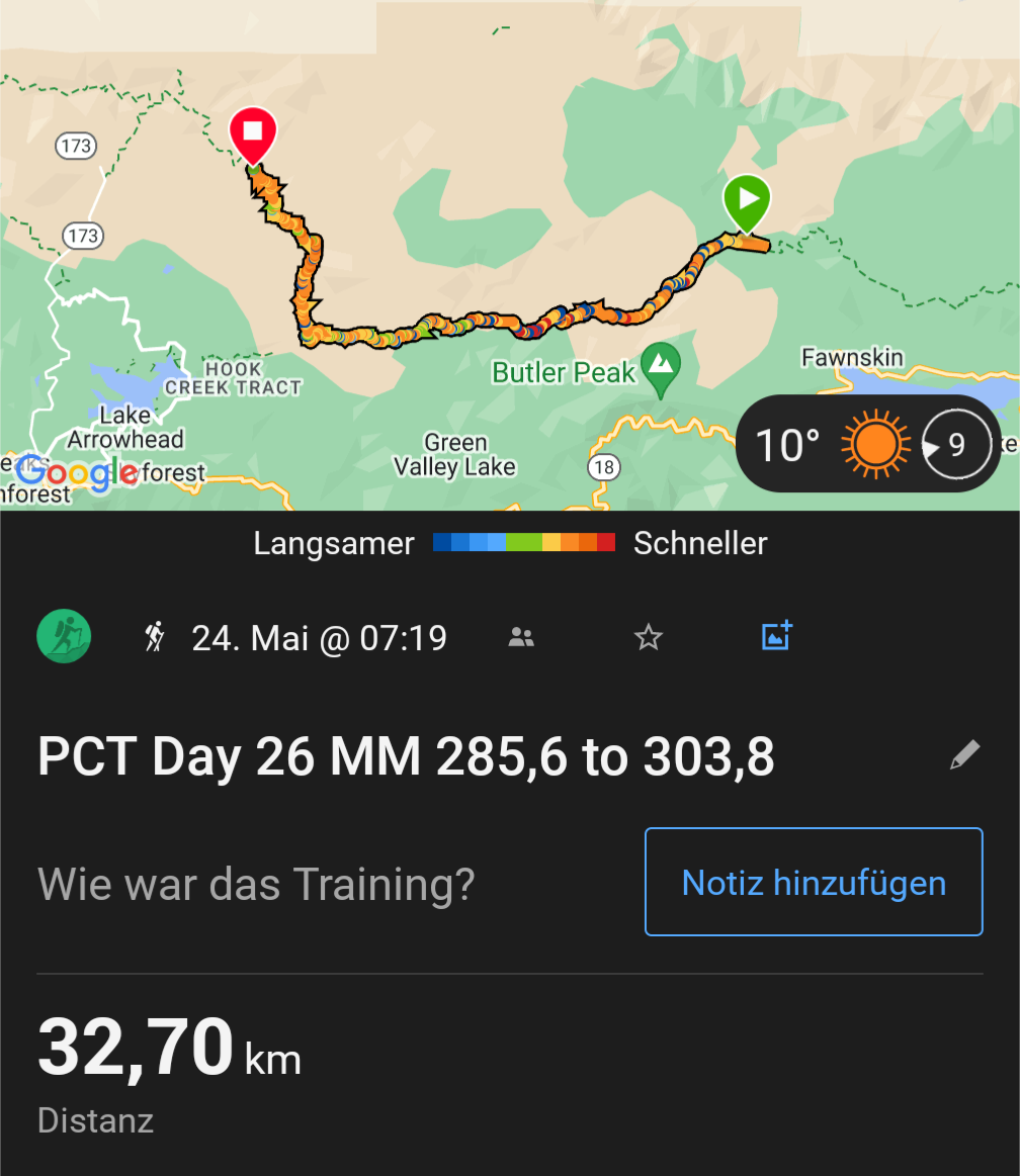 Im letzten Abschnitt des Mission Creek habe ich mir wohl die Achilles Sehne verletzt und musste nach einen erfolglosen Versuch weiterzulaufen abbrechen und bin wieder zurück nach Big Bear um zwei weiter Tage zu ruhen. Am Don 23.5 ging es dann wieder weiter. Die ersten beiden Tage waren da die bisher Anstrengenden, wegen der Sehne und weil ich aus irgendeinem Grund fürchterlich erschöpft war. Zum Glück waren die ersten drei Tage fast ausschließlich Abstieg und nicht besonders anspruchsvoll. Das Frühstück bei MacD war dabei eine erfrischende Abwechslung,vor allem die Soda Fontaine, also das unbeschränkte Nachfüllen der Limo war für meine ausgetrocknete Kehle eine Wohltat. Das musste dann in den nächsten zwei Tagen reichen, da Kamm dann ein 17 Meilen Abschnitt mit kontinuierlichen Anstieg ohne Wasser. Am Mo 27.5 hab ich an der letzten Wasserstelle ein lange Pause, 5L Wasser geladen und zwei Liter auf Vorrat getrunken um am Nachmittag die ersten 9mi bis zum Zeltplatz aufzusteigen. Tags drauf dann nochmal 12 mi bis zum Trailhead. Von dort habe ich dann direkt ein Ride nach Wrightwood von einer Gruppe älterer Day Hikers bekommen. Jetzt mach ich wieder Zero, hab Pizza und Bier und bin gerade ziemlich Faul.