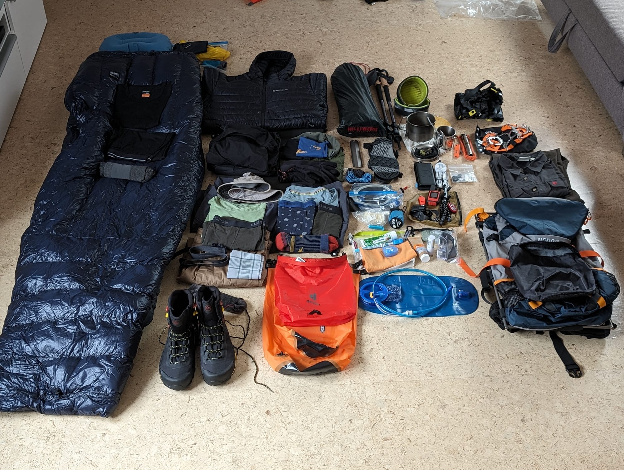 Das Bild enthält zusätzlich die Gaiters, Spikes und Hose/Hemd für die High Sierra. Das werde ich in San Diego zusammen mit einen Bear Canister nach Kennedy Meadows vorausschicken.