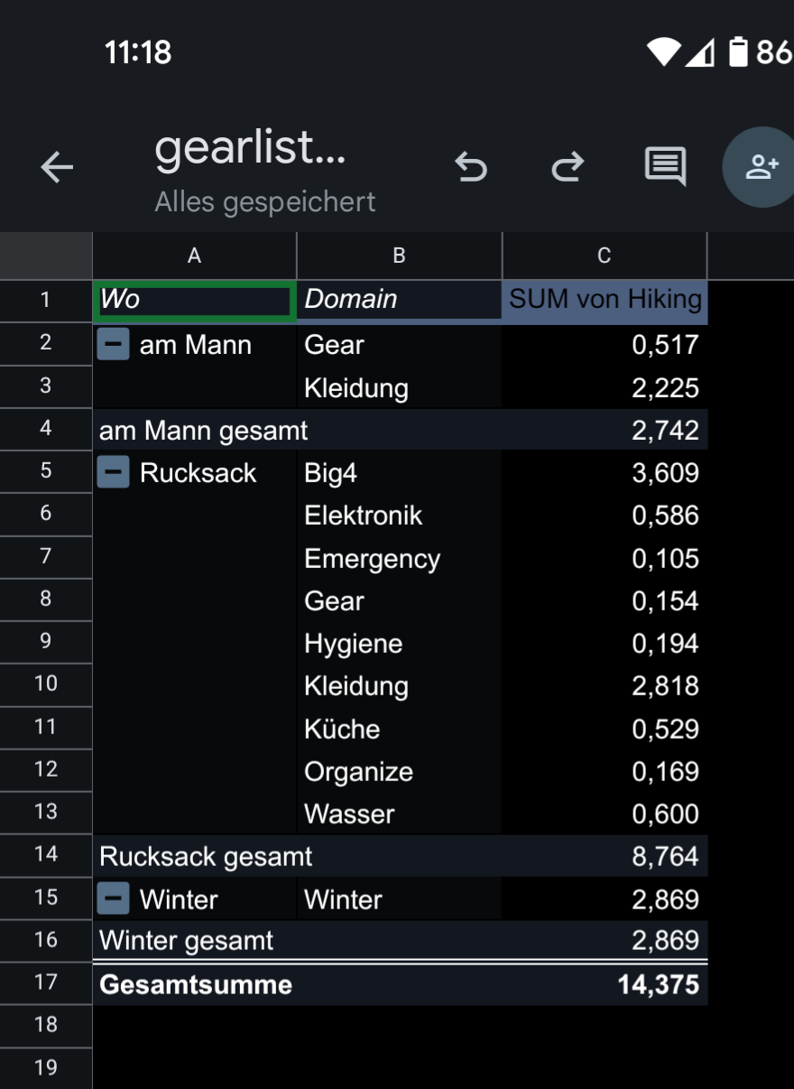 Jeder Hike beginnt mit einer Packliste. Meine ist in den letzten Wochen entstanden und kontinuierlich optimiert worden, bis letztendlich ein Rucksackgewicht von ca 9kg ohne Wasser und Essen meine persönlichen Anforderungen an Komfort und Gewicht genügt.